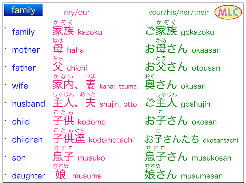 - family: 家族 かぞく kazoku / ご家族 ごかぞく gokazokku