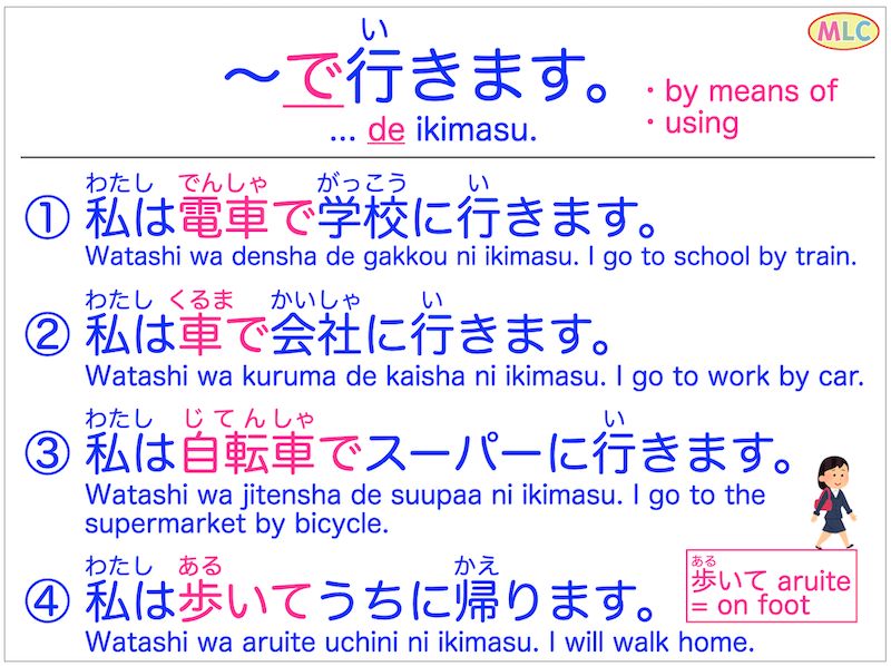 - わたしはじてんしゃでがっこうに いきます。Watashi wajitensha degakkou ni ikimasu. = I go to school by bicycle.