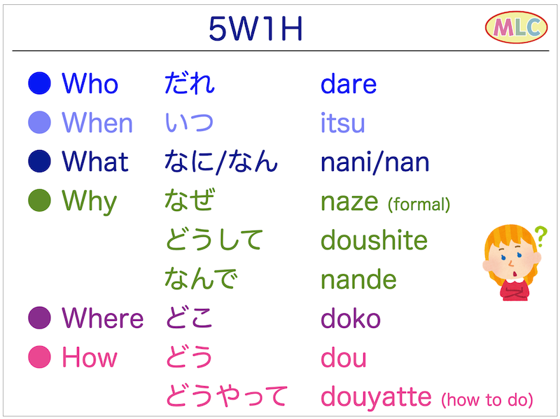 Learn JLPT N5 5W1H question words: dare (who), nani (what), itsu (when), doko (where), naze (why), dou (how). Free examples, audio, practice + KANA/Romaji worksheets with answers available for download! Start at MLC Japanese.