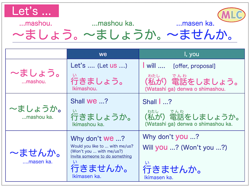 (let's start), ikimashou (let's go), shimashou ka (what shall we do?).