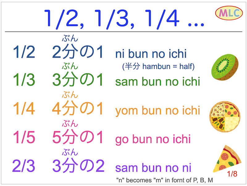 - 1/2 2ぶんの1 ni bun no ichi (はんぶん hambun = half)